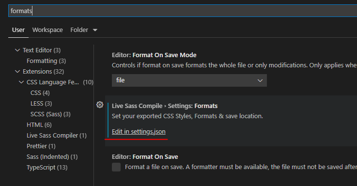 ๊ทธ๋ฐ ๋ค์, ํ๊ฒฝ ์ค์ ํญ ์๋จ์ ๊ฒ์์ฐฝ์ ใformatsใ๋ฅผ ๊ฒ์ํ ๋ค์ Live Sass Compiler ํญ๋ชฉ์์ [Edit in setting.json]์ ํด๋ฆญํฉ๋๋ค.