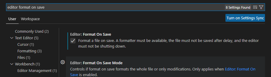 ๊ทธ๋ฐ ๋ค์, ํ๊ฒฝ ์ค์ ํญ ์๋จ์ ๊ฒ์์ฐฝ์ ใeditor format on saveใ๋ฅผ ๊ฒ์ํ๊ณ ๊ฐ์ฅ ๋จผ์ ๋์ค๋ [Editor: Format On Save] ์ฒดํฌ๋ฐ์ค๋ฅผ ์ฒดํฌํด์ฃผ์ธ์.