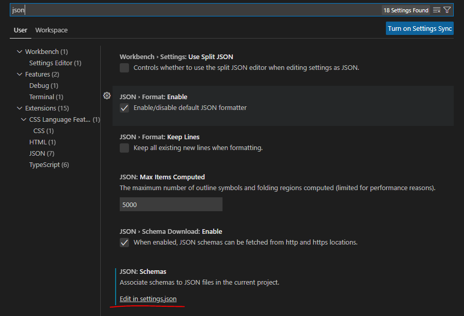 ์ฒดํฌ๋ฅผ ๋ง์น์ จ๋ค๋ฉด, ๋ ๋ค์ ๊ฒ์์ฐฝ์ ใjsonใ์ ๊ฒ์ํ์ ๋ค์ [JSON: Schemas] ํญ๋ชฉ์ [Edit in settings.json]์ ํด๋ฆญํฉ๋๋ค.